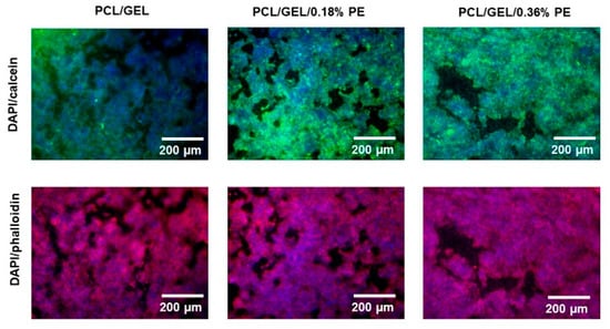 On the other hand, HaCaT cells cultured on electrospun nanofiber surfaces were examined under a fluorescence microscope. Figure 7 shows the fluorescence images of HaCaT cells seeded on the electrospun nanofiber mats after being stained with DAPI-calcein and DAPI–phalloidin. For this purpose, the DAPI-calcein staining was used to analyze the cytoplasm of live cells (green) and cell nuclei (blue), whereas DAPI-phalloidin was used to investigate the cell nuclei (blue) and the presence of cell cytoskeleton protein (red). The images show that HaCaT cells were well spread throughout the matrix in all electrospun nanofiber mats. Additionally, it was confirmed that the incorporation of PE into PCL/GEL electrospun nanofibers had no toxic effect on HaCaT cells.