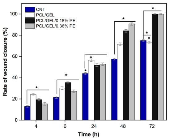 To better evaluate the potential of the electrospun nanofibers for wound healing applications, an in vitro wound healing assay (scratch) using HaCaT cells was performed. In this test, it was assumed that HaCaT cells attempted to migrate along the edges of the scratch zone to establish cell-cell contact, which led to the closure of the wound. Both cell migration and wound closure rate were monitored over time (Figure S3 and Figure 8, respectively). The optical microscopy images show that HaCaT cells migrated to the scratch zone after 72 h incubation when in contact with PE-loaded PCL/GEL electrospun nanofibers. These results were confirmed by the determined wound closure rates (Figure 8). Similarly, the PE-loaded electrospun nanofibers increased the wound closure rate compared to the PCL/GEL nanofiber. After 72 h of treatment, the PE-loaded PCL/GEL electrospun nanofiber mats achieved a complete wound closure, whereas the PCL/GEL electrospun nanofiber mats and the control (CNT) reached 75 ± 1% and 73 ± 1% of wound closure, respectively. These findings are in agreement with the cell viability results, showing that PE-loaded PCL/GEL electrospun nanofiber mats enhanced the viability and migration of the HaCaT cells.