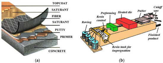 Prefabricated systems consist of premanufactured cured straight strips, laminates/plates, or rods, which are installed through the use of adhesives. Pre-manufactured FRP reinforcements are usually made through the process of pultrusion (see Figure 1b). This results in much stiffer plastic that cannot be damaged or unfolded, and bending is sufficiently limited compared to a wet lay-up system. Therefore, the use of prefabricated laminates eliminates all anchoring methods in which the laminate needs to be unfolded or damaged in any way.