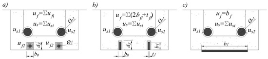 where ta is the thickness of the manufacturer's recommended adhesive layer, the value is between 1 ÷ 4 mm, but for safety reasons, it should be taken equal to ta = 1 mm; Gc is the shear modulus of the concrete; Act.eff—effective area of tensile concrete (Equation (8)) [51]; Lb.eff—effective bond length (e.g., minimum anchorage length) (Equation (9)), which is the lower one: bond length, effective force transfer length [52], concrete crack spacing.