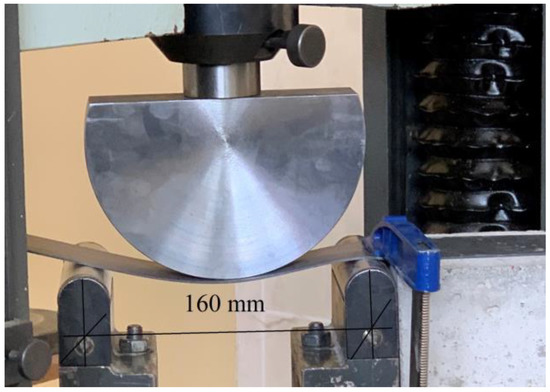 The bending capabilities of the 50 mm-wide CFRP laminate plate (tensile strength ff = 2627.61 MPa) were first tested. A test machine with a 160 mm base was used for this purpose (Figure 3).