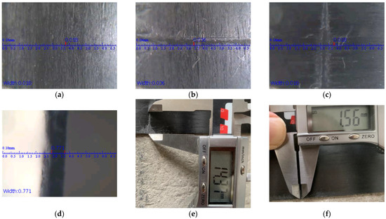 Damage to the laminate: (a) undamaged laminate, (b) damage image perpendicular to the fibre, (c) damage image parallel to the fibre, (d) decrease in laminate thickness at the site of damage, (e) damage height, and (f) damage width.