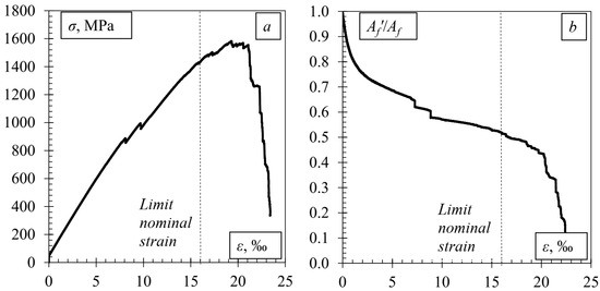 CFRP direct tension test results: (a) stress and strain dependence graph; (b) reduction in the effective resistance area to the applied force.