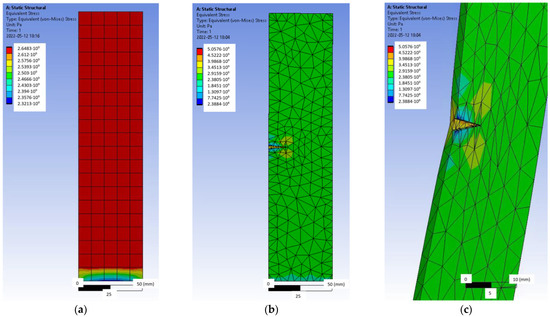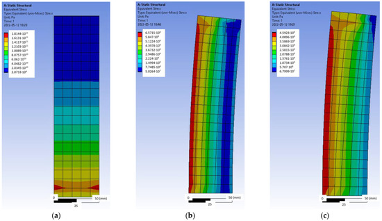 Tensile test simulation with Ansys: (a) pressure and tension simultaneously, (b) eccentric load action, e = 0.25 bf, and (c) eccentric load action, e = 0.125 bf.