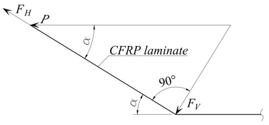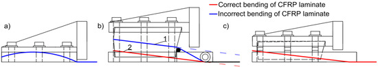 Slaitas and Valivonis [36] found in their proposed prestressing equipment that while using a bending angle α up to 10°, no additional force of pressing the laminate onto the concrete surface is required (Figure 11).