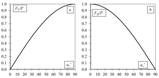 Influence of angle α on tensile force components: (a) vertical component; (b) horizontal component.