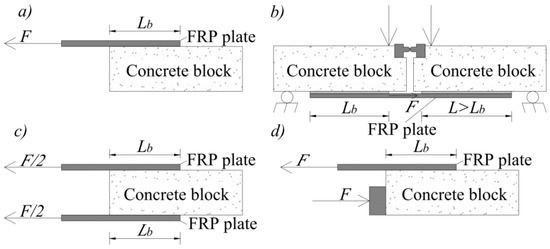 In this paper, four types of pull-off/out shear tests were analysed: single lap shear tests (SLST) (Figure 12a), bending shear tests (BST) (Figure 12b), double lap shear tests (DLST) (Figure 12c), and push–pull shear tests (PPST) (Figure 12d).
