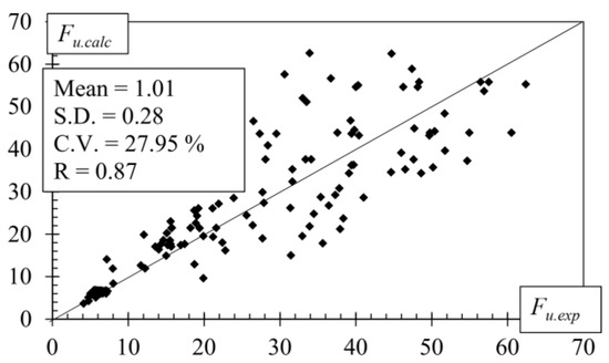 A great variety of different pull-off/out shear tests was analysed with a low systematic error (1.01), relatively low random error (0.28) and coefficient of variation (27.95%), and a high coefficient of correlation (0.87). It can be concluded that the ultimate pull-off/out shear load was predicted sufficiently, precisely taking into account the variety of samples. This means that the required anchoring length of the externally bonded and near-surface mounted FRP reinforcement can be determined with sufficient accuracy and ease by varying Equations (3) and (9).