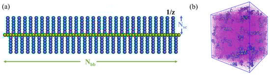 The bottlebrush architecture in the reference case is shown in Figure 1a, where the beads representing the backbone are shown in green and the beads within the side chains are shown in blue. The number of backbone and side chain beads are denoted as Nbb = 62 and Nsc = 6, respectively, and the grafting density is set to z = 1. The grafting density equal to one and the ratio between the number of beads within the backbone and within the side chain is chosen based on the experimental data []. We model the cases where the backbone beads have high affinity with the solvent beads (abb-sol = 78) and low affinity with the side chain beads (abb-sc = 89). The choice of these parameters based on the measured interfacial tensions for the examples of molecular bottlebrushes synthesized in the concurrent experiments is provided in our recent study []. In what follows, we vary the affinities between side chain and solvents (asc-sol) within the relatively wide range.