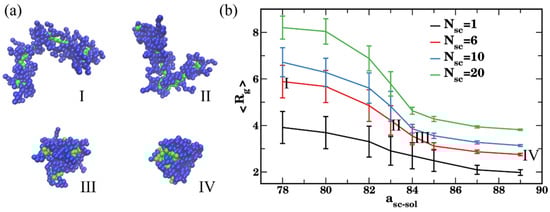 We first characterized equilibrium conformation of a single bottlebrush with a chosen architecture dependent upon solvent quality. Specifically, we calculated the radius of gyration, relative shape anisotropy, eigenvalue ratio, and acylindricity of a single bottlebrush (Equations (4)–(6)) at late times upon reaching an equilibrated conformation in solvents of various qualities. These structural characteristics are then compared with the same structural characteristics of bottlebrushes within the agglomerates formed during the self-assembly of multiple bottlebrushes (Section 3.2 below) to identify the effect of agglomeration on these characteristics. We vary the repulsion parameter asc-sol between the side chain and solvent beads to tailor the side chain affinity to the solvent. The side chain–solvent repulsion parameters are chosen in independent series of simulations as asc-sol = {78,80,82,83,84,85,87,89}, where asc-sol = 78 represents a high affinity corresponding to a good solvent and asc-sol = 89 indicates a low affinity corresponding to a poor solvent. Figure 2a shows representative late time snapshots of a bottlebrush in solvents of different qualities, solvent beads are not shown for clarity of representation. Upon the decrease in the affinity of the side chain and solvent beads, the transition from the random coil to the globule conformation is clearly observed by comparing bottlebrush conformations I–IV in Figure 2a.