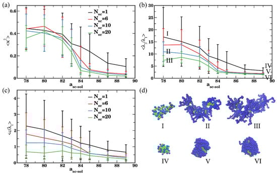 Same trends are further confirmed by comparing an average ratio between the largest and smallest eigenvalues, (Figure 3b), and an average acylindricity normalized on the smallest eigenvalue, (Figure 3c). The normalization on the in the latter plot is needed for more direct comparison between the structural characteristics of macromolecules with highly disparate dimensions; the acylindricity , as well as ratios are provided in Figure S2. These plots confirm that the bottlebrushes remain highly globular for Nsc = 6, 10, and 20 at high asc-sol while for Nsc = 1 both and remain relatively high even at the highest asc-sol considered. For the solvents with high affinity to the side chains, the values decrease with an increase in Nsc, indicating the lowest acylindricity normalized per smallest linear size in the system for the macromolecules with the longest side chains. We also note large error bars in the calculated values in Figure 3a–c for all the cases except the cases corresponding to nearly globular conformations. These large error bars indicate a broad distribution of macromolecular conformations upon equilibration and are on the same scale as observed in the prior studies of shape anisotropy of various polymers [,].