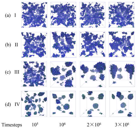 To examine the effects of the bottlebrush architecture on the agglomeration process, multiple bottlebrushes constituting 5% of total volume fractions are placed in a good solvent (Case I, asc-sol = 78), solvents of intermediate quality (asc-sol = 83, asc-sol = 84 for Cases II and III, respectively), and poor solvent (asc-sol = 89, Case IV). In these series of simulations, the longer side chains are chosen with respect to that in the reference case, specifically Nsc = 10 and Nsc =20. To keep the total number of bottlebrush beads at 5% of the total number of beads, the numbers of bottlebrushes are reduced with respect to that in the reference case to nMBB = 49 for Nsc = 10 (NT = 662) and nMBB = 26 for Nsc = 20 (NT = 1262). The representative time evolution simulation snapshots are shown in Figure S4 and Figure S5, respectively.