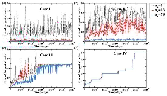 Time evolution of the size of the largest cluster size (number of bottlebrushes) in various solvents: (a) asc-sol = 78 (Case I), (b) asc-sol = 83 (Case II), (c) asc-sol = 84 Case (III), and (d) asc-sol = 89 (Case IV). Black dotted, red dash-dotted, and blue solid lines of the same color represent the number of contacts used to identify clusters (nc = 1, 13, and 78, respectively).