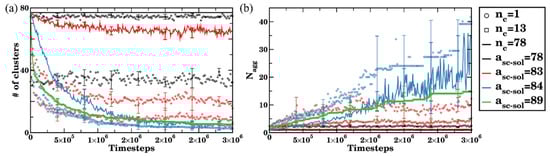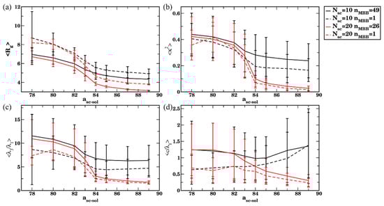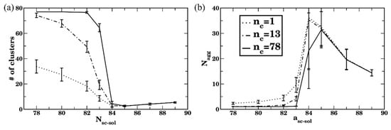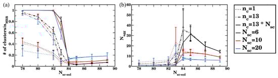 For the simulations of bottlebrush conformations in relatively poor solvents (asc-sol ), all three criteria defined above result in an identical number of clusters upon equilibration (Figure 11a). These results show that the number of clusters in equilibrium normalized on nMBB decreases with an increase in Nsc in poor solvent. Note that an average size of the cluster in equilibrium expressed via the number of bottlebrush beads—as well as the number of clusters in equilibrium without the normalization on nMBB—remain approximately the same for all Nsc considered (Figure S8) for the solvents with asc-sol; this is due to the fact that the same volume fraction (5%) of bottlebrushes with different architectures is used. Finally, the aggregation number—as defined in Equation (7) (expressed in the number of bottlebrushes) with the cutoff criterion nc = 13 Nsc—is notably lower for higher Nsc (for asc-sol ) due to the larger number of beads comprising a single bottlebrush. For the solvents with relatively high affinities to the side chains (asc-sol , the lowest cutoff value (nc , dotted curves) results in highest for the longest side chain, indicating a more pronounced contribution of short-lived agglomerates, while nc = 13 Nsc results in = 1 (Figure 11b). For the solvents of intermediate quality (82 asc-sol 84), the transient clusters are more pronounced for the longer side chains, as can be seen in shifting the transient regions to the left (to the lower asc-sol) in both plots with an increase in Nsc (Figure 11).