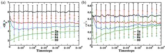 The agglomeration process is distinctly different in Cases III and IV. The process is notably faster for Case IV (green curve, solid line for nc = 78) than that for Case III (in blue, solid line for nc = 78) since the driving force for the agglomeration due to the differences in affinities of the side chains and solvent is the strongest in Case IV. Furthermore, an average aggregation number—which reflects an average size of the cluster—changes approximately stepwise for the average (and strictly stepwise for each individual run) for the Case IV, confirming the non-reversibility of the agglomeration process noted above (i.e., a particular bottlebrush joining a cluster belongs to this cluster for the remainder of the simulation run). On the contrary, large absolute values of and extensive variations in these values with time are observed for Case III (blue solid line in Figure 6b), indicating that even using nc = 78 criteria accounts for the notable contribution of short-lived relatively large agglomerates since the transient agglomeration is an inherent feature of the aggregation process for this solvent of intermediate quality.