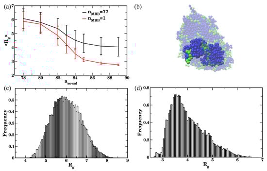 (a) Radius of gyration (<Rg>) of bottlebrushes upon equilibration as a function of sidechains affinity for nMBB = 77 (black curve) and for the single bottlebrush (red curve). The values are averaged over all nMBB = 77 bottlebrushes in four independent simulation sets within last 3 × 105 timesteps (60 frames for each set), error bars represent standard deviation. (b) Representative snapshot highlighting a single bottlebrush that is a part of the larger cluster (asc-sol = 89, t = 105). (c,d) Distribution of Rg in good solvent asc-sol = 78 (in (c)) and in poor solvent asc-sol = 89 (in (d)) for nMBB = 77 bottlebrushes in four sets within the last 3 × 105 timesteps.