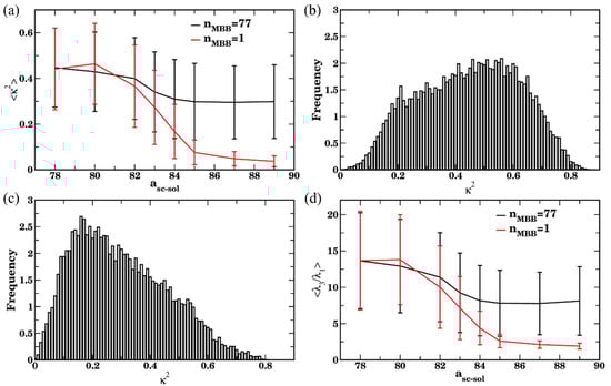 (a) Shape anisotropy κ2 upon equilibration as a function of side chains affinity for nMBB = 77 (black curve) and for the single bottlebrush (red curve). (b,c) Distribution of the κ2 in good solvent asc-sol = 78 (in (b)) and in poor solvent asc-sol = 89 (in (c)) for 77 bottlebrushes in four sets with the last 3 × 105 time steps. (d) Ratio of eigenvalues λ3/λ1 upon equilibration as a function of side chains affinity for nMBB = 77 (black curve) and for the single bottlebrush (red curve). In (a,d), the data are averaged over all 77 bottlebrushes in four sets within the last 3 × 105 time steps (60 frames for each set), error bars represent standard deviation. In (b,c), data used to plot distributions includes relevant characteristics of all 77 bottlebrushes in four sets within the last 3 × 105 timesteps.