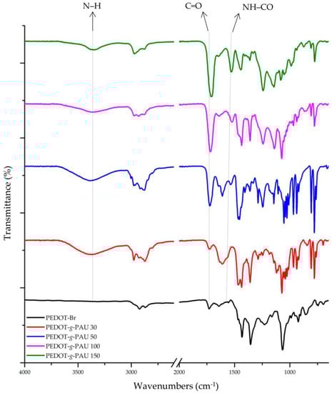 In order to identify the functional groups of the synthesized products and determine the success of the synthesis, the samples were analyzed by FTIR spectroscopy and Table 1 shows all the signals for the characteristic group of all the products. The FTIR spectra of the ThBr and acrylate-urethane monomers are shown in Figure 1. They all show the characteristic signals indicating that the desired monomers were successfully synthesized. Bands with peaks at 2980 cm−1 and 2860 cm−1 were attributed to the stretching of C–H bonds of the methyl groups, and bands with peaks at 1730 cm−1 and 1703 cm−1 indicate the presence of a carbonyl group in the ThBr and AU monomers, respectively. Characteristic bands indicating the stretching of the C=C and C–C bonds of the thiophene ring in the ThBr monomer are visible in the range from 1462 cm−1 to 1389 cm−1. Figure 2 shows the spectra of the PEDOT-Br macroinitiators and the main products of the PEDOT-g-PAU copolymer obtained by grafting AU onto PEDOT-Br macroinitiators, in which the signals of all characteristic functional groups can also be observed. Comparing the spectra of the PEDOT-Br macroinitiators and the PEDOT-g-PAU graft copolymers, the appearance of characteristic signals for N–H bonds, NH–CO bonds and C–N bonds can be observed. The observed broad band in the range from 3381 cm−1 to 3360 cm−1 corresponds to N–H stretching, while the appearance of signals in the spectra of the graft copolymers in the range from 1564 cm−1 to 1521 cm−1 and at about 1245 cm−1 is due to NH–CO and C–N bonds, respectively. It should be mentioned that O–H stretching from humidity could contribute to some extent to the broad peak in the 3600–3200 cm−1 range. No water was used in the ATRP reaction and the samples were dried in a vacuum dryer, but it cannot be excluded that the samples adsorbed a small amount of moisture from the air. However, we assume that it is a small amount that could have only a minor effect on the IR spectra. The appearance of the new bands is the result of grafting AU onto the macroinitiator PEDOT-Br, in whose spectrum these bands are not present, indicating the success of the synthesis. It is important to note that the signal intensity of the carbonyl group C=O increases with the increase in the content of acrylate-urethane monomers in the grafted copolymers.
