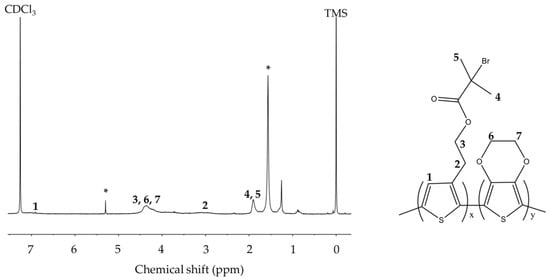 Figure 4 shows the 1H NMR spectra of PEDOT-Br. At 1.91 ppm, a signal characteristic of ThBr is observed that corresponds to the protons of two equivalent methyl groups. At 4.36 ppm, the signal generated by the overlap of the signals characteristic of the protons of the CH2 group of the ThBr and the signal corresponding to the EDOT monomer is observed (positions 3, 6 and 7). At 6.92 ppm, a signal corresponding to the protons of the thiophene ring (position 1) is observed. The absence of two signals visible in the spectrum of ThBr monomers in this part of the spectrum confirms the success of macroinitiator synthesis. Signals related to residual solvents can also be observed in the spectrum. A singlet bound to water is visible at 1.57 ppm, a singlet bound to dichloromethane at 5.30 ppm (both marked with *), and a singlet bound to chloroform at 7.26 ppm.
