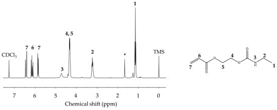 The NMR spectrum of the AU monomer is shown in Figure 5. At 1.14 ppm, a triplet is present relative to the protons of the methyl group at position 1 of the AU. The signal at 3.23 ppm relates to the protons of the CH2 group at position 2 of the AU, which are shaded due to the close proximity of the N atom, while in the range from 4.55 ppm to 4.25 ppm, a multiplet is visible corresponding to the protons at positions 4 and 5 of the AU. The singlet at 4.73 ppm corresponds to the proton of the NH group, while the triplet at 6.15 ppm refers to the proton at position 6. The doublets at 5.86 ppm and 6.44 ppm refer to the 2 protons at position 7 of the AU. Since rotation is disabled by the presence of a double bond, these two protons are not equivalent and signal splitting occurs. The spectrum also shows singlets at 7.27 ppm and 1.66 ppm (marked with *), indicating residual chloroform and water, respectively.