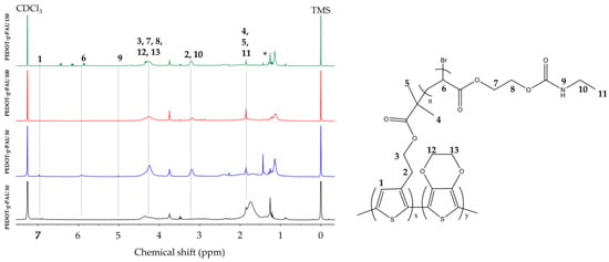The average molecular weight values for the macroinitiator PEDOT-Br are higher than the literature values [], and from the obtained results, the synthesized graft copolymers PEDOT-g-PAU have higher average molecular weight values compared to PEDOT-Br. Such a result is expected, since grafting the side chains AU onto PEDOT-Br should increase the molecular weights. With the increasing AU content in the copolymers, a gradual increase in the numerical and mass-average molecular weight is observed. Mn and Mw increased more than double for sample PEDOT-g-PAU 150 when compared to the macroinitiator. The ratio of the numerical and mass-average molecular weights was used to determine dispersion, which is a measure of the heterogeneity of the system. The relatively low Đ values of copolymers indicate a narrower molecular weight distribution when compared to PEDOT-Br. Đ in the range of 1.21 to 1.36 for graft copolymers PEDOT-g-PAU indicates the narrow distribution of molecular weight, which can be expected from controlled radical polymerizations such as ATRP []. Much wider distribution with the dispersity of 1.53 is visible for PEDOT-Br macroinitiator where oxidative polymerization was used.
