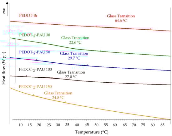 DSC analysis was performed on samples of PEDOT-Br macroinitiator and grafted PEDOT-g-PAU copolymers to determine the glass transition temperature of the samples (Figure 7). As can be observed in the figure, the very weak signal of Tg of PEDOT-Br is visible at 64.6 °C and it corresponds to the literature []. By introducing soft AU side chains, the graft copolymers show a significant decrease in the glass transition temperature to 33.6 °C, 29.7 °C, 27.0 °C and 24.8 °C for PEDOT-g-PAU 30, PEDOT-g-PAU 50, PEDOT-g-PAU 100, and PEDOT-g-PAU 150, respectively, reflecting their much softer nature than the PEDOT-Br backbone. The introduction of AU side chains into the structure of the PEDOT-Br copolymer resulted in the formation of an amorphous phase within the polymer structure, which increased its flexibility. The obtained PEDOT-g-PAUs exhibited a glass transition below body temperature, which enables their potential application in wearable electronics.