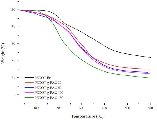The thermal properties of PEDOT-Br macroinitiator and PEDOT-g-PAU graft copolymers were studied by TG analysis. The obtained TG curves showing the dependence of mass loss on temperature are shown in Figure 8. From the obtained thermograms, the temperature at 10% mass loss, T90, the temperature at 50% mass loss, T50, and the residual mass at 600 °C after pyrolytic degradation in N2 are evident (see Table 3). The residual mass after pyrolytic degradation indicates the mass of the sample, which consists of charred structures formed as a product of polymer degradation. From the TG curves, it is clear that the degradation of all the samples occurs in several steps. The first mass loss at temperatures up to 100 °C refers to residual solvents, followed by the decomposition of the remaining monomers in the sample. At higher temperatures, the resulting products of PEDOT-Br and PEDOT-g-PAU decompose. The results of the thermal analysis of the PEDOT-Br macroinitiators show the temperatures of the onset of decomposition above 200 °C, the T50 temperature of 464.9 °C and the residue after pyrolysis of 41.4%, indicating the good thermal stability of this polymer. The obtained graft copolymers PEDOT-g-PAU have lower T90 and T50 values compared to PEDOT-Br. The T90 value correctly decreases from 201 °C to 153 °C with increasing PAU content, while the T50 value also correctly decreases from 465 °C as for the macroinitiators to 260 °C as for PEDOT-g-PAU. The same is true for the char residue, which ranges from 19% to 29% for grafted polymers. Therefore, it can be concluded that the introduction of AU side chains decreases the thermal stability of the polymer, which was expected since it is known from the literature that urethane bonds begin to dissociate at around 150 °C [].