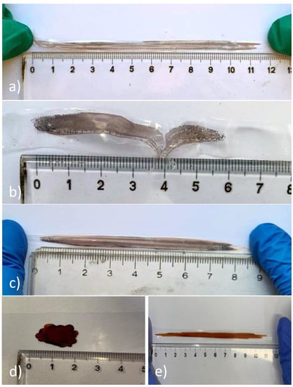 Stretching of the final product, (a) PEDOT-g-PAU 30, (b) PEDOT-g-PAU 50, (c) PEDOT-g-PAU 100, (d) PEDOT-g-PAU 150 before stretching; (e) PEDOT-g-PAU 150 stretched at cca 500%.