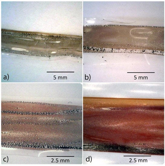 To test the stretchability of the synthesized samples, a graft copolymer THF solution was manually applied in a thin layer to a low-density polyethylene film. After solvent evaporation, the films were stretched by hand, and the appearance of the PEDOT-g-PAU films was observed. Pictures of films are shown in Figure 9. All films were able to stretch to about 500% of their starting length, which was approximately 2 cm. At those extensions, LDPE substrates started to break, so it can be assumed that the synthesized copolymers could be stretched even higher. All samples were able to stretch to 500% with the exception of sample PEDOT-g-PAU 50, where the LDPE substrate broke at around 300% (Figure 9b). A digital microscope was used to closer observe the appearance of films in stretched condition at around 300% and the pictures are shown in Figure 10. It can be observed that the samples PEDOT-g-PAU 30 and PEDOT-g-PAU 50 started to peel and delaminate from the substrates, indicating a lack of adhesion as they neared the elongation limit. Somewhat better behviour was observed for sample PEDOT-g-PAU 100 where delamination started to occur only where the layer of applied polymer was thicker. Finally, the sample PEDOT-g-PAU 150 with the highest amount of PAU showed that stretched layer is stable, without any traces of peeling from LDPE. Even the edges (Figure 10d, lower edge) where the applied layer was thicker wereable to fully withstand substrate stretching.