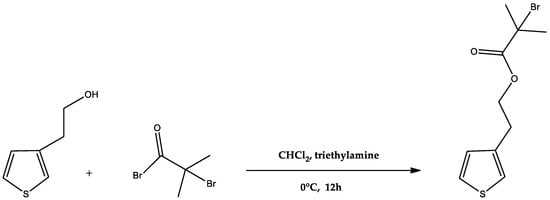 The first step in the synthesis of PEDOT-g-PAU copolymers is the synthesis of monomer 2-(thiophene-3-yl) ethyl 2-bromo-2-methylpropanoate (termed ThBr) according to the literature with modifications []. To a 250 mL flask immersed in an ice bath, 100 mL of dichloromethane was added, which was purged with nitrogen for 15 min. Then, 8.7 mL (76.6 mmol, 1 equivalent) of 3-thiophenethanol and 12.2 mL (87.6 mmol, 1.1 equivalent) of triethylamine were added. The reaction mixture was stirred for 10 min to deprotonate 3-thiophenethanol. After 10 min, 10.8 mL of 2-bromoisobutyryl bromide (87.6 mmol, 1.1 equivalent) was added dropwise to the reaction mixture. The reaction mixture was stirred at room temperature for 12 h under a stream of nitrogen to provide an inert atmosphere (Scheme 1). After 12 h, the reaction mixture was washed 3 times with 100 mL of distilled water and once with 100 mL of saturated NaCl solution. The organic layer was separated and dried over MgSO4, evaporated on a rotary evaporator, and the residual product was purged with nitrogen. The product was then purified by column chromatography on silica gel using dichloromethane as eluent. The fractions were checked on TLC plates and the desired fractions were collected in a round bottom flask, after which the solvent was evaporated on a rotary evaporator. The product obtained was ThBr monomer. For ThBr, 1H NMR (600 MHz, chloroform-d) δ 7.28 (dd, 1H), 7.09–7.04 (m, J = 3.0, 1.0 Hz, 1H), 7.00 (dd, J = 4.9, 1.3 Hz, 1H), 4.38 (t, 2H), 3.03 (t, J = 6.6, 0.7 Hz, 2H), 1.91 (s, 6H).
