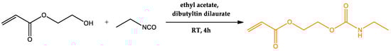 The synthesis of the acrylate-urethane monomer was carried out according to the recipe in the literature [] with modifications (Scheme 2). A total of 4 mL (54.6 mmol, 1 equivalent) of ethyl isocyanate and 5.9 mL (49.5 mmol, 1.1 equivalents) of 2-hydroxyethyl acrylate were added to the reactor with constant stirring. Then, 5 drops of dibutiline dilaurate were added to the reaction mixture. The synthesis was carried out under a stream of nitrogen with constant stirring for 4 h. It was then diluted with 20 mL of dichloromethane and washed with deionized water to remove the unreacted 2-hydroxyethyl acrylate. The remaining deionized water was removed by adding Na2SO4, after which the mixture was filtered. The urethane acrylate obtained was characterized by infrared spectroscopy with Fourier transform and nuclear magnetic resonance. For AU, 1H NMR (300 MHz, chloroform-d) δ 6.44 (dd, J = 17.3, 1.5 Hz, 1H), 6.15 (dd, J = 17.3, 10.4 Hz, 1H), 5.86 (dd, J = 10.4, 1.5 Hz, 1H), 4.73 (s, 1H), 4.45–4.25 (m, 4H), 3.23 (p, J = 6.9 Hz, 2H), 1.14 (t, J = 7.3 Hz, 3H).