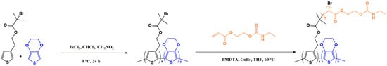 The synthesis of the macroinitiators PEDOT-Br was carried out according to the recipe in the literature [] with modifications, where the monomer ratio was fixed and EDOT:ThBr = 1:1. Masses of 3.000 g (10.8 mmol, 1 equivalent) of ThBr monomer and 1.539 g (10.8 mmol, 1 equivalent) of EDOT monomer were dissolved in 100 mL of chloroform in a reactor that was immersed in an ice bath and purged with nitrogen for 10 min. A total of 5.267 g of (32.5 mmol, 3 equivalents) FeCl3 was dissolved in 50 mL of nitromethane, and the prepared solution was transferred to a dropping funnel. The oxidant solution was added dropwise to the reaction mixture at 0 °C under a stream of nitrogen. After the reaction had been carried out for 30 min under a stream of nitrogen, the nitrogen was replaced by argon. The reaction was carried out for 24 h and then quenched by adding 200 mL of methanol. The product obtained is a copolymer of PEDOT-Br in the doped state, which was filtered and added to 200 mL of a solution of NH4OH:CH3OH = 1:1 to achieve dedoping and stirred in this solution for 1 h. The dedoped polymer was then filtered and washed with methanol to remove the residual FeCl3. The product obtained consisted of soluble and insoluble PEDOT-Br, and to isolate the soluble part, Soxhlet extraction was performed using chloroform as solvent. A solution of the polymer in chloroform was obtained, after which the solvent was evaporated in a rotary evaporator. Drying yielded 3.2% of a black powder of the macroinitiator PEDOT-Br.