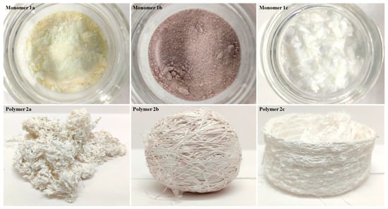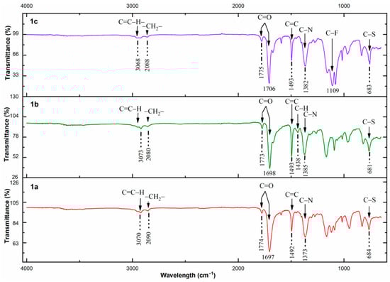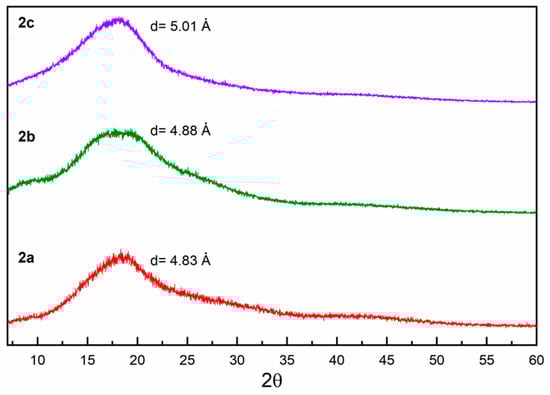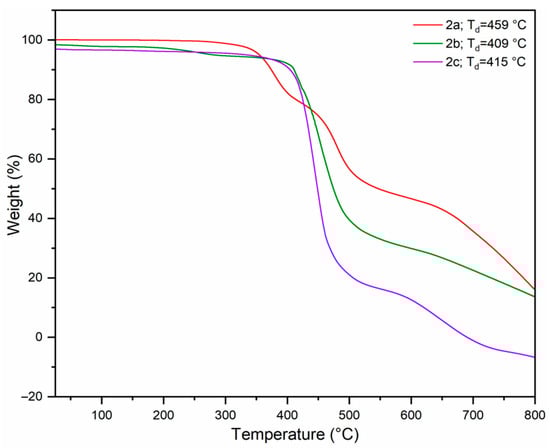 The monomers and polymers obtained were characterized using the following techniques: Fourier-transform infrared spectroscopy (FT-IR), nuclear magnetic resonance (NMR), differential scanning calorimetry (DSC), thermomechanical analysis (TMA), thermogravimetric analysis (TGA) and X-ray diffraction (XRD). The FT-IR spectra were recorded in a Thermo Scientific Nicolet iS10 FT-IR spectrometer using an attenuated total reflectance (ATR) accessory with a diamond crystal. The final spectrum is an average of thirty-two spectra collected for each sample in a range of 4000–650 cm−1 at a spectral resolution of 4 cm−1. The 1H-NMR, 13C-NMR and 19F-NMR spectra were recorded on a Bruker Avance III HD at 400, 100 and 376 MHz, respectively. Tetramethylsilane (TMS) and hexafluorobenzene (HFB) were used as internal standards for the NMR analysis. The samples were measured in CDCl3 for 1a, 1b, 1c, 2b and 2c, while the polymer 2a was measured in DMF-d7. DSC was carried out in a SENSYS evo DSC, with samples encapsulated in standard aluminum DSC pans, at a scanning rate of 10 °C min−1 under a nitrogen atmosphere in a temperature range between 30 °C and 500 °C, and it was used for determining the glass transition temperature (Tg) of the polymers. The TMA was carried out in a TA Instruments Thermomechanical Analyzer TMA Q400, at a rate of 10 °C min−1 under a nitrogen atmosphere to corroborate the Tg values. TGA was conducted to determine the onset of decomposition temperature (Td) of the polymers. The samples, around 10 mg, were heated at a rate of 10 °C min−1 from 30 to 600 °C under a nitrogen atmosphere in a TA Instruments Thermogravimetric Analyzer TGA 5500. XRD measurements were performed in polymer films on a Bruker D2-Phaser 2nd Generation diffractometer between 7 and 70° 2θ, at 30 KV 10 mA, using CuKα radiation (1.54 Å). The polymer density (ρ) was measured in film form in ethanol at room temperature using the analytical balance model Sartorius Quintix 124-1s by the flotation method.