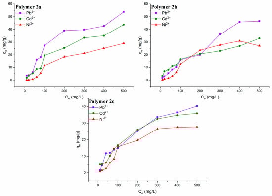 qe) of the three polymers as a function of the heavy metal solution concentration (