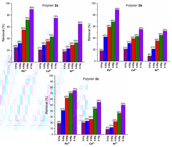The equilibrium adsorption capacity behavior of the three polymers was studied by varying the amount of each polymer to adsorb heavy metals in an aqueous media. The heavy metal removal percentage against the mass of polymer is shown in