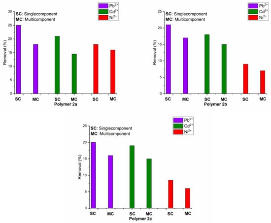 Figure 10, where it is possible to observe a decreasing trend in the removal of all ions. The decrease in the uptake of these heavy metal ions in the multicomponent mixture compared to that achieved in non-competitive circumstances could be due to the content for the same available adsorption sites on the thiol-functionalized polymer surface, the gradual active sites saturation and the shielding effect generated by the other competing metals. The removal efficiency order found is as follows: Pb