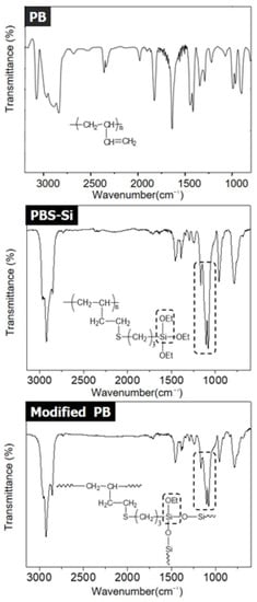 Spectra data of PB: 1H-NMR (cm−1, δ) 5.53–5.33 (m, 1H, -CH=CH2), 4.95–4.87 (t, 2H, -CH=CH2), 2.12–1.97 (t, 1H, -(CH2-CH)-), 1.26–1.17 (m, 2H, -(CH2-CH)-). Spectra data of PBS-Si: 1H-NMR (cm−1, δ) 3.84 (q, 6H, -OCH2CH3), 2.65–2.18 (m, 4H, -CH2-S-CH2-), 1.82–1.58 (m, 4H, -CH2-CH2-S-CH2-CH2-CH2-Si), 1.23 (t, 9H, -OCH2CH3), 1.10–1.03 (m, 1H, -(CH2-CH)-), 1.01 (s, 2H, -(CH2-CH)-), 0.74 (t, 2H, -CH2-Si-). Spectra data of PB: FT-IR: ν = 3081 (sp2 C-H stretch), 2975–2844 (sp3 C-H stretch), 1639 (C=H stretch). Spectra data of PBS-Si: FT-IR: ν = 2975–2844 (sp3 C-H stretching), 1169–1111 (Si-O-C asym stretching), 956 (Si-O-C sym stretching). Spectra data of modified PB: FT-IR: ν = 2975–2844 (sp3 C-H stretching), 1169–1111 (Si-O-C asym stretching), 956 (Si-O-C sym stretching).