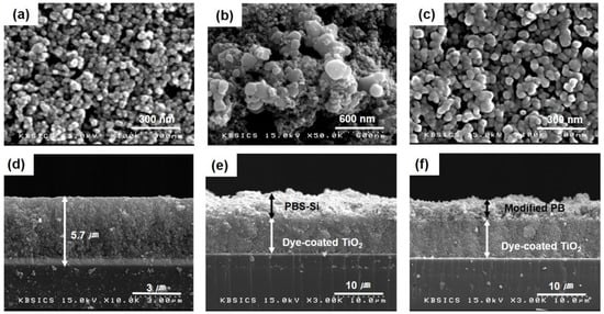 Figure 5a,d show top and cross-sectional FESEM images of the dye-coated TiO2 film before the coating of PBS-Si. Figure 5b,e show the corresponding images after the coating of PBS-Si. Figure 5c,f show the corresponding images of modified PB fabricated after 72 h of PBS-Si coating. Before the coating of PBS-Si, TiO2 nanoparticles were distinguishable with sizes of 10–30 nm. After the coating of PBS-Si, they were irregularly covered with the PBS-Si materials. The cross-section was also very rough film. In the modified PB, fabricated after 72 h of PBS-Si coating, the TiO2 particle sizes apparently increased, and the images of the nanoparticles became indistinct. These images clearly indicated that the modified PB penetrated deep into the pores of the TiO2 film and became uniformly distributed in the film. The thickness of the cross-section was a little shrunk compared to Figure 5e. The penetration and impregnation of modified PB, that resulted from the gelation, were essential for interfacial contact between the dye-coated TiO2 film and the electrolyte.
