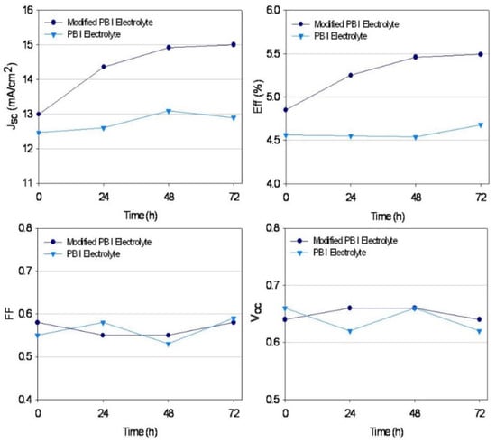 A plot showing values of short-circuit current density, open-circuit voltage, fill factor, and efficiency of DSSC device measured during 72 h.