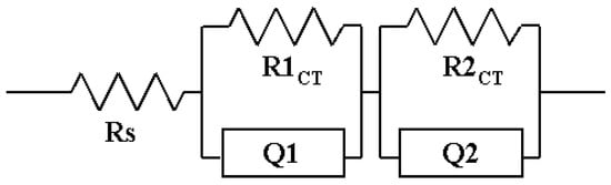 An equivalent circuit for EIS for DSSCs based on modified PB, PB, and electrolyte; Rs: Series resistance; R1CT: charge transfer resistance of Pt/electrolyte interface; R2CT: charge transfer resistance of TiO2/Dye/electrolyte interface; Q1 and Q2: constant phase element.