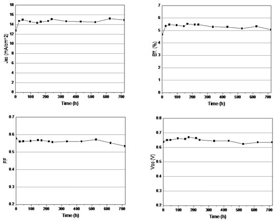 In particular, operational stability is one of the most important factors affecting a photovoltaic device. This has been overcome, to a large extent, by using good sealing methods and appropriate chemicals. In the present study, DSSC devices using modified PB were fabricated for long-term stability tests. DSSC devices were stored in darkness at room temperature for 720 h, and their photovoltaic performance stabilities were measured using a Solar Simulator. Figure 9 shows the detailed evaluation results of the device parameters during 720 h of aging at room temperature in air. As shown in Figure 9, the Jsc and efficiency were drastically increased during the initial gelation. The DSSC device also maintained over 90% of its initial Voc and FF after 720 h (Voc = 0.635 V, Jsc = 14.93 mA/cm2, FF = 0.53, Eff. = 5.06% after 720 h). The photovoltaic parameters showed little change during 720 h of aging after the gelation. These very encouraging results will foster practical applications of DSSCs. This result indicates that modified PB in DSSC devices might have exceeded chemical reactions by the sol-gel process during aging in long-term stability tests. No more increase of efficiency was found after the gelation was over.
