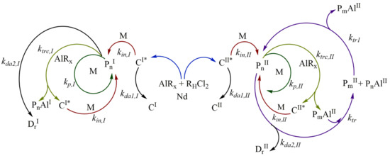 The polymer chain (PnI, PnII) transfer to the alkyl-aluminum cocatalyst (chain transfer agent, AlRx) generates inactive species (inactive chains for monomer insertion located on aluminum, PnAlI and PnAlII) and regenerates new active centers (C1 I*, C1 II*), which can continue the initiation and propagation reaction. The type I inactive species, PnAlI, are considered dead polymers (PnAlI = DnI) in this work; the inactive species of type II, PnAlII, are considered “dormant species”.