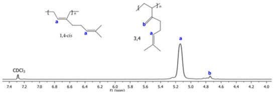 The microstructure of the resulted poly(β-myrcene) samples was calculated by 1H and 13C nuclear magnetic resonance (NMR) acquired in a Bruker BioSpin-400 MHz spectrometer, using 16 and 140,000 scans, respectively. CDCl3 was used as a solvent and the analyses were performed at 25 °C. A concentration of 15 mg of sample in 1 mL of CDCl3 was used for the 1H-NMR spectra and 80 mg of sample in 1 mg of CDCl3 for the 13C-NMR spectra.