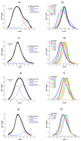Molecular weight distributions: (a) MWD and the deconvolution for Exp. 1 at 2.6% of conversion; (b) Evolution of the MWD in conversion for Exp. 1; (c) MWD and the deconvolution for Exp. 3 at 9.9% of conversion; (d) Evolution of the MWD in conversion for Exp. 3; (e) MWD and the deconvolution for Exp. 4 at 5% of conversion; (f) Evolution of the MWD in conversion for Exp. 4; (g) MWD and the deconvolution for Exp. 5 at 1.9% of conversion; and (h) Evolution of the MWD in conversion for Exp. 5. Figure S1 in the Supporting Information shows the plots for Exp 2.
