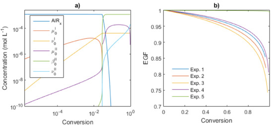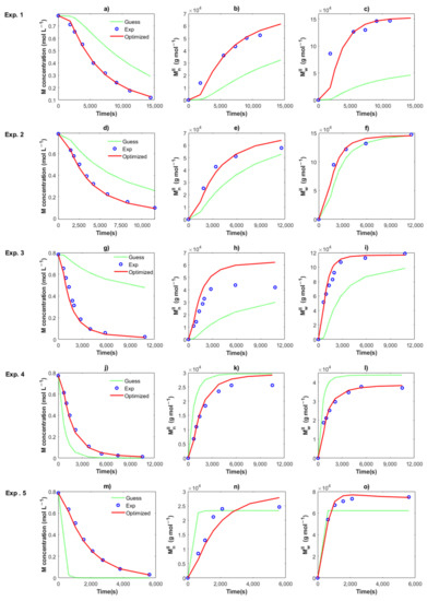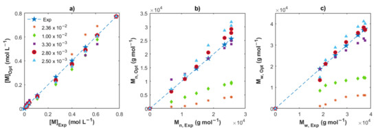To estimate the effective concentration of DIBAH which takes place in the chain transfer step, Cavalcante de Sá et al. [16] used a reconciled amount of DIBAH; we understand by a reconciled amount, an equivalent proportion related with Np. This procedure was feasible because no deactivation reaction was considered in the reaction mechanism. However, there are chain deactivation reactions involved in our proposed scheme (Figure 1), so the assumptions to calculate the effective concentration of DIBAH used as the chain transfer agent made by Cavalcante de Sá et al. are not valid in this context. In this work, as a first approximation, we estimated the effective concentration of DIBAH ([AlRx]0) using several values as input of the optimization program, from the total concentration considered in the recipes to low levels. In Figure 5 the experimental measurements ([M], Mn and Mw) are plotted versus the optimal values obtained by the algorithm for Exp. 4, varying the [AlRx]0 from 2.36 × 10−2 to 2.5 × 10−3 mol L−1. While high values of [AlRx]0 resulted in strong deviations in Mn and Mw principally, the value of [AlRx]0 = 2.8 × 10−3 mol L−1 provided the best fit with the lowest value of the SSE. Using a high [AlRx]0, the activation state of the chains is reduced, predominating the dormant state in the polymerization, and the number of monomers added to the propagating chains becomes less; therefore, the Mn and Mw is also low. The closest match between experimental and simulated values for the set of Exps. 1, 2 and 3 is found for the resulting in a mean value of 1.2 × 10−3 mol L−1. The values found for Exps. 4 and 5 are 2.8 × 10−3 and 3.5 × 10−3 mol L−1, respectively. The percent of the [AlRx]0 regarding the initial concentration of DIBAH are 5.08, 16.09 and 11.95%, which are in the same interval reported by Cavalcante de Sá et al. (from 10 to 40%) for the isoprene CCTP experiments using another initial reagent concentrations ([RHCl2]0/[Nd]0 = 0.5) and temperatures [16]. As mentioned previously, the termination steps, the operating conditions and the reagent ratios considered in this work do not allow a strict comparison with that work, but we could highlight the low effective concentration of DIBAH involved in the CCTP for both systems.