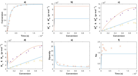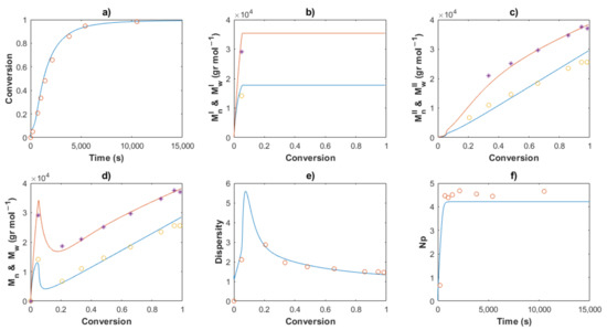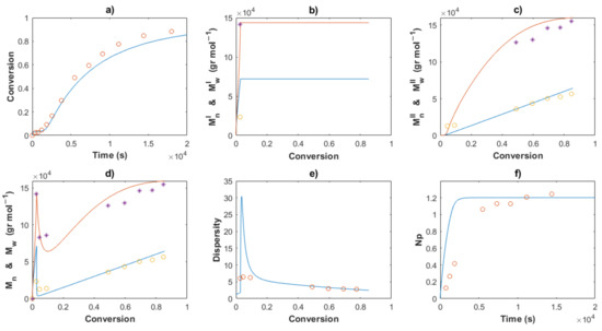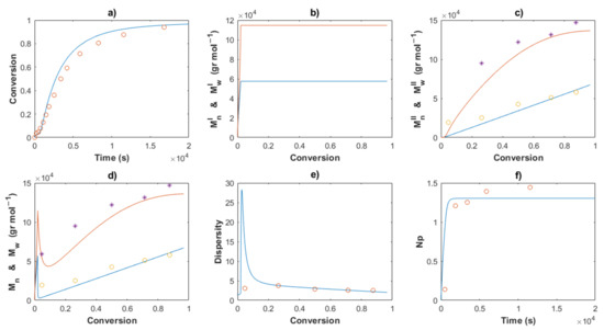 Comparison between the experimental data (symbols) and the model solutions (lines) for the Exp 5: (a) Conversion profiles, (b) MnI and MwI versus conversion, (c) MnII and MwII versus conversion, (d) Mn and Mw versus conversion, (e) Dispersity, (f) Np versus time.