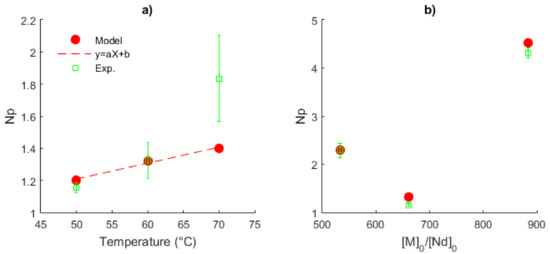 Table 2 shows the values for the kinetic parameters obtained after this step for all the cases and Figure 7 and Figure 8 show a comparison between the experimental data (symbols) and the solution of the mathematical model (lines) for Exps. 4 and 5, respectively. An excellent description of the conversion profiles, MnI, MwI for the polymer of Type I, MnII, MwII for the polymer of Type II, and Mn, Mw for overall measurements, dispersities and Np was obtained for all cases. According to Hustad et al. [36], the actual β-myrcene CTTP can be categorized as a semireversible chain transfer process, since the condition ktrc,II > ktr,II holds true for all cases. Additionally, the coefficient of determination, Equation (44), and the standard deviation (S), Equation (47), were calculated for the corresponding data of [M], Mn and Mw, and the values are shown in Table 3. The profiles of [M] present values of R2 around the unit and low values of S for all the experiments, attributable to the higher quantity of experimental measurements and the good fit. The values R2 and S also show a good fit for the other two characteristics, Exp. 2 being the better for Mn, and Exp. 4 being the best fit for Mw.