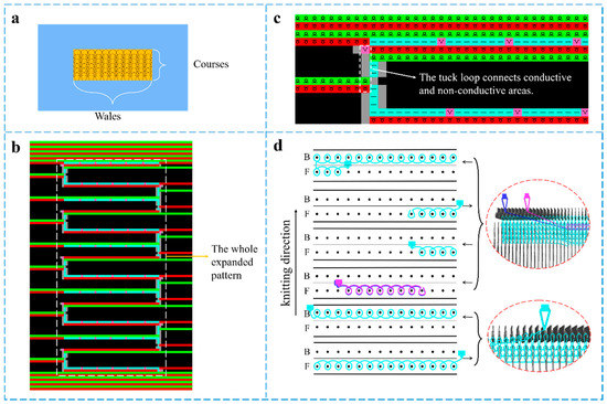 Pattern design and knitting process of the knitted strain sensor (a) compression pattern design (b) expanded pattern in the design system and (c) single pattern cycle (d) the knitting process and simulation of a single pattern.