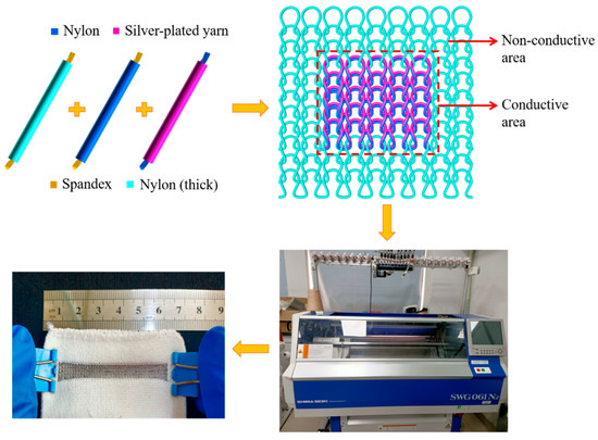 The preparation process of the knitted strain sensor is illustrated in Figure 2. The elastic nylon filament was knitted to form the non-conductive area as a fabric substrate. Every loop in the conductive area consisted of two overlapping yarns, in which the silver-plated nylon yarn appeared at the technical surface of the strain sensors, with the nylon/spandex composite yarn at the back. The two areas were connected by a tuck loop.