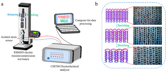 Research on sensing mechanism of the knitted strain sensor, (a) illustration of the measuring device, and (b) loop change of the strain sensor during the horizontal stretching process.